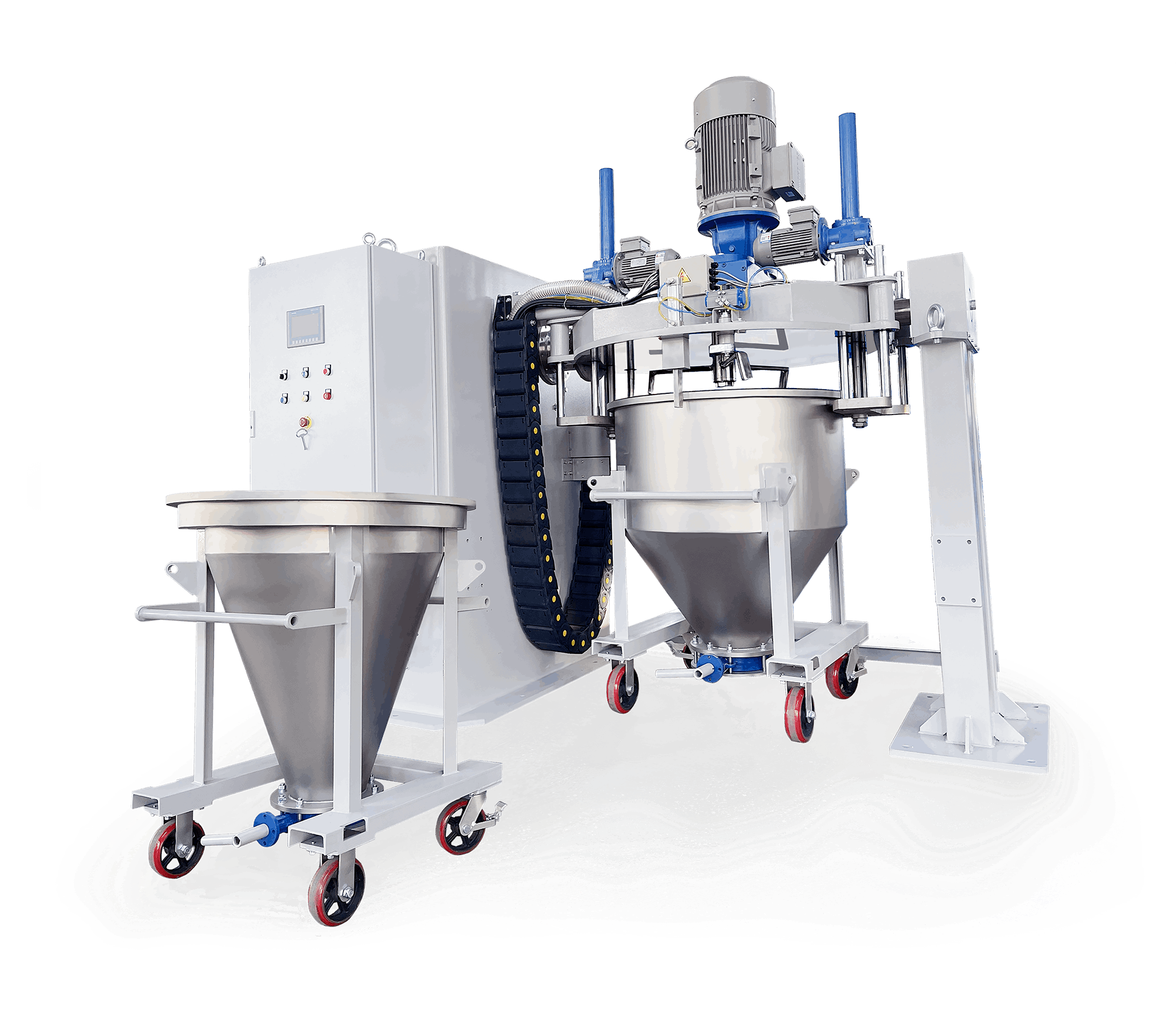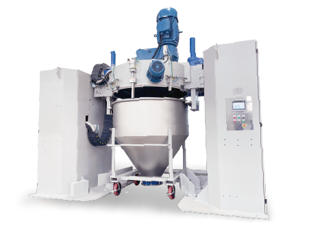 LCM系列翻轉(zhuǎn)式自動混合機LCM系列混合機采用可移動式料斗,適用于各種粉末及粒狀材料的混合攪拌。裝有待混合原料的料斗推到工位后,自動控制系統(tǒng)將其提升,與攪拌頭(可配置冷卻水套)安全鎖定。料斗與攪拌頭一起翻轉(zhuǎn) 180 度,在攪拌槳和破碎輪的作用下,完成對物料的攪拌和混合。混合完成后,料斗自動回到原工位,與攪拌頭分離。