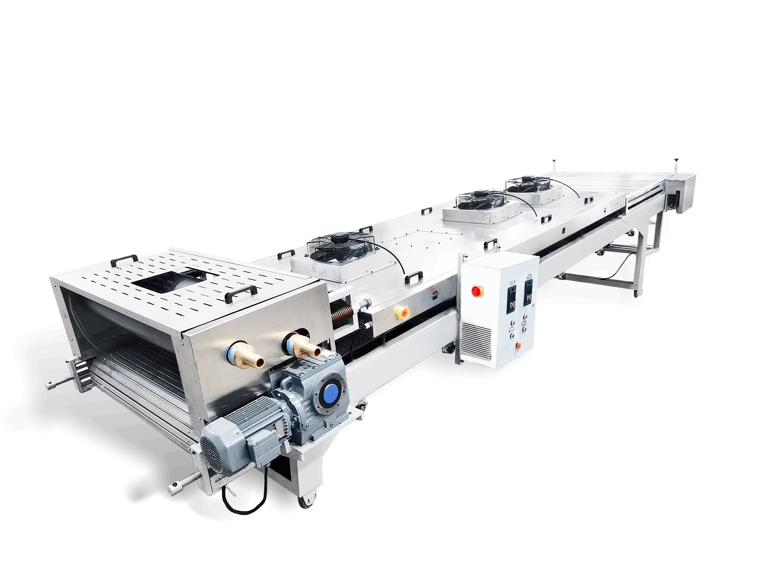 YPJ系列不銹鋼鏈板壓片機(jī)由冷卻壓輥、不銹鋼節(jié)片輸送帶、破碎和風(fēng)冷系統(tǒng)組成。擠出機(jī)擠出的熱熔融狀物料經(jīng)冷卻壓輥壓成 1-2mm 片狀,在不銹鋼節(jié)片輸送帶上風(fēng)冷至常溫,破碎成片狀物料排出。可選配有空氣過(guò)濾,冷熱交換系統(tǒng)。