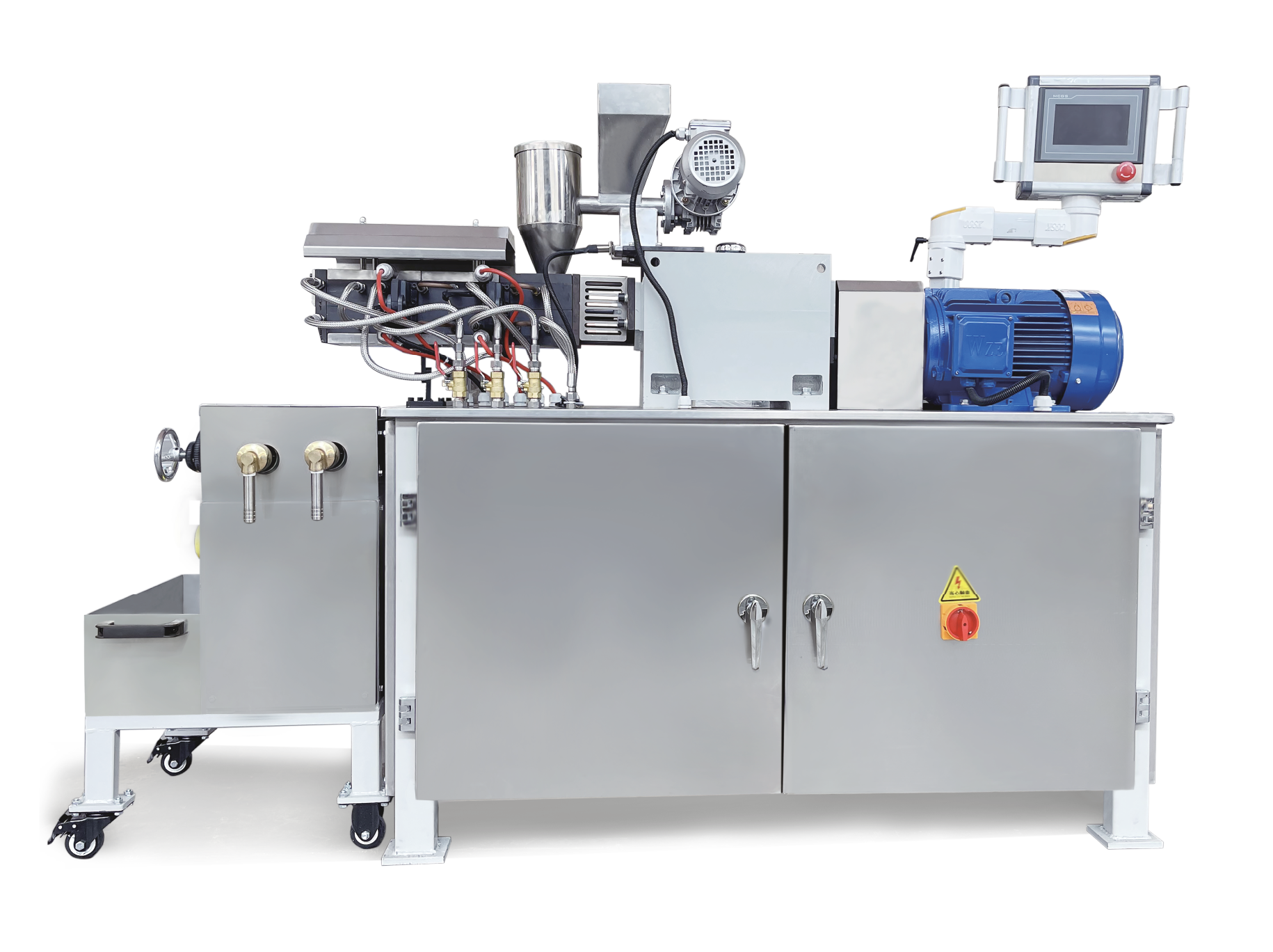 SLJ系列實(shí)驗(yàn)室雙螺桿擠出機(jī)設(shè)計(jì)新穎,結(jié)構(gòu)緊湊合理,集擠出、壓片于一體,其混煉效果可與大機(jī)相媲美,是研制粉末涂料生產(chǎn)工藝、品種開(kāi)發(fā)、校色的理想設(shè)備。原料在高速旋轉(zhuǎn)精密?chē)Ш蠅K的作用下,進(jìn)行充分的分散和分布混合。實(shí)驗(yàn)室雙螺桿擠出機(jī)是粉末涂料生產(chǎn)的關(guān)鍵設(shè)備。